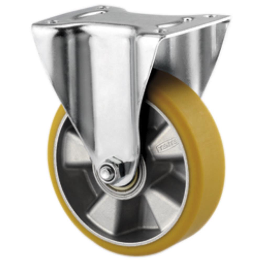 Fast hjul med bred gaffel i svær stålplade. Nav i aluminium med polyuretanbane samt DIN-kugleleje. Med pladebefæstigelse. Fås i flere varianter.