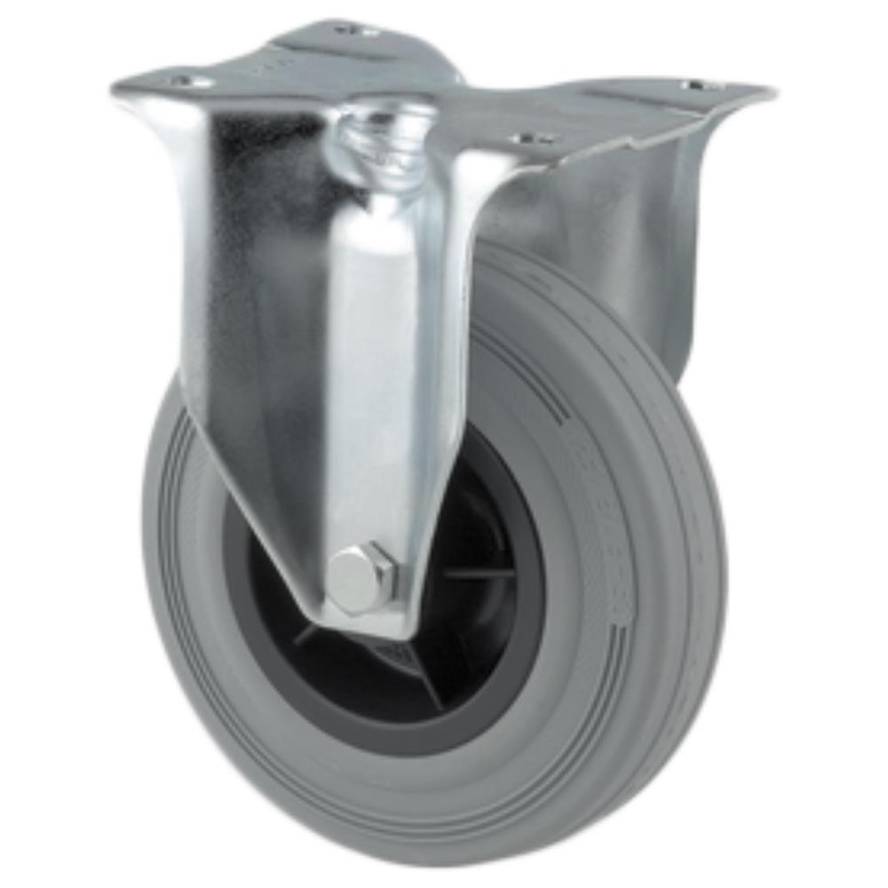 Fast hjul med bred gaffel i svær stålplade. Grå massiv polypropylen gummi med rulleleje uden trådfang. Med pladebefæstigelse. Fås i flere dimensioner.