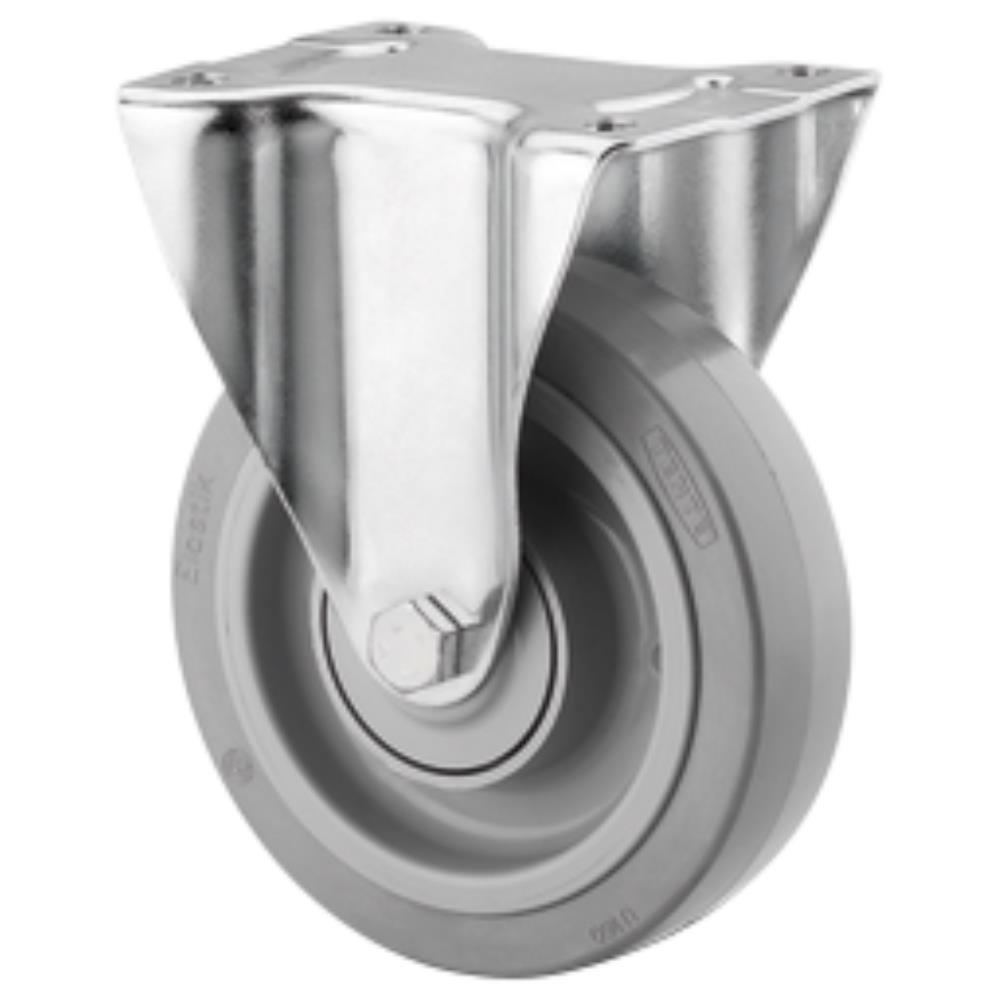 Fast hjul med bred gaffel i svær stålplade. Polyamid med blå elastisk gummi samt DIN kugleleje. Med pladebefæstigelse. Fås i flere dimensioner.