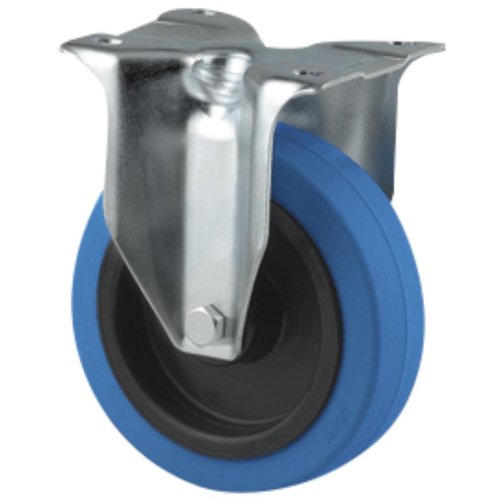 Fast hjul med bred gaffel i svær stålplade. Polyamid med blå elastisk gummi samt rulleleje uden trådfang. Med pladebefæstigelse. Fås i flere dimensioner.