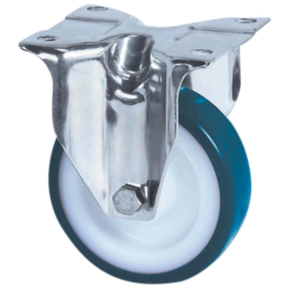 Fast transporthjul i rustfrit stål med bred gaffel samt nittet dobbelt kuglekrans. Nav i polyamide med polyuretan samt rustfrit rulleleje. Med pladebefæstigelse. Fås i flere dimensioner.