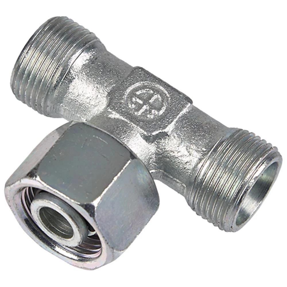 Stilbar T-forskruning. Udvendig/udvendig/indvendig metrisk gevind. Formonteret med O-ringstætning. Uden omløber og skærering. Let serie. TN 420, DIN 2353. Fås i flere dimensioner.