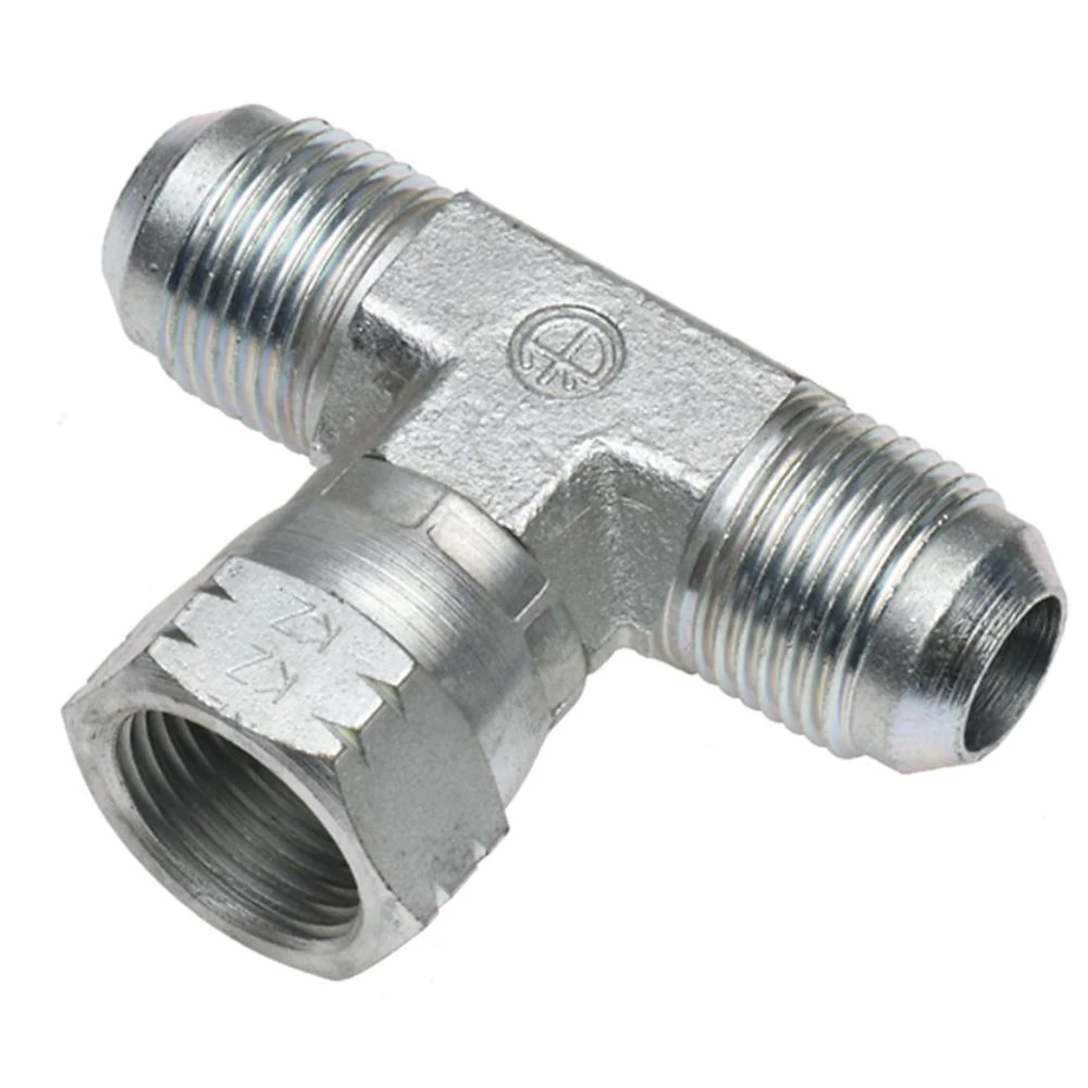 Hydraulisk t-stykke med 1 omløber JMMF. JIC han 37° konus × JIC han 37° konus × JIC hun 37° konus. Tommer. Fås i flere dimensioner.