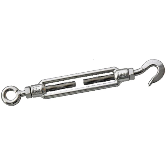 Syrefast, AISI 316 bardunstrammer med øje og krog til stramning af stålwirer. Velegnet til maritimt brug og i korrosive miljøer. I henhold til DIN 1480. Fås i flere dimensioner.