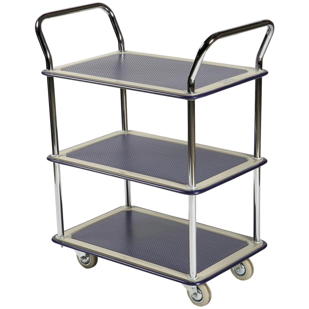 Robust og handy til lette transportopgaver på lageret eller kontor. Let at manøvrere, da den er udstyret med 2 drejelige og 2 faste massive gummihjul. Hylderne er belagte med skridsikker belægning. Forkromet håndtag. Beskyttende stødfangere.
