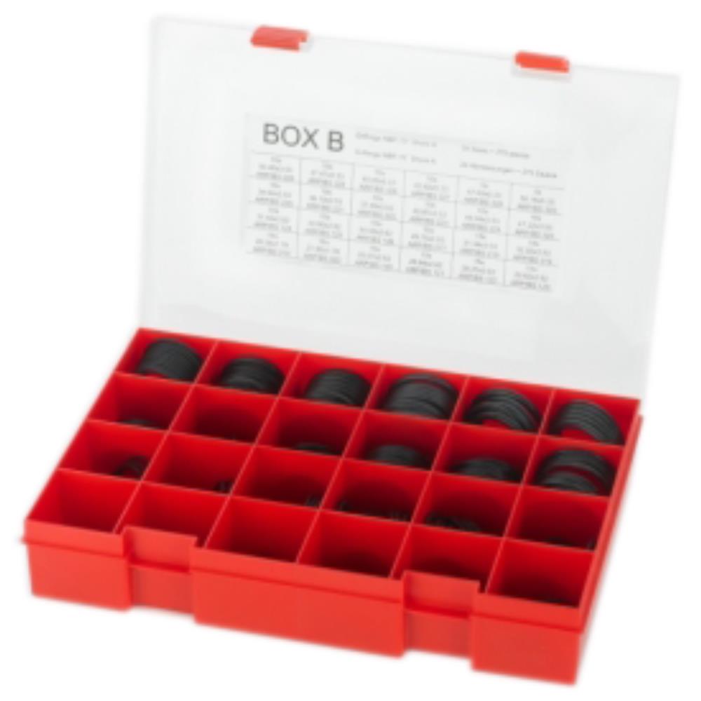 Box B er et sortimentsæt med 275 stk. O-ringe i NBR-70 eller NBR-90, fordelt på 24 forskellige dimensioner. Det er en praktisk og økonomisk løsning til applikationer, hvor god tætningsevne og modstandsdygtighed mod olie og fedt er afgørende.