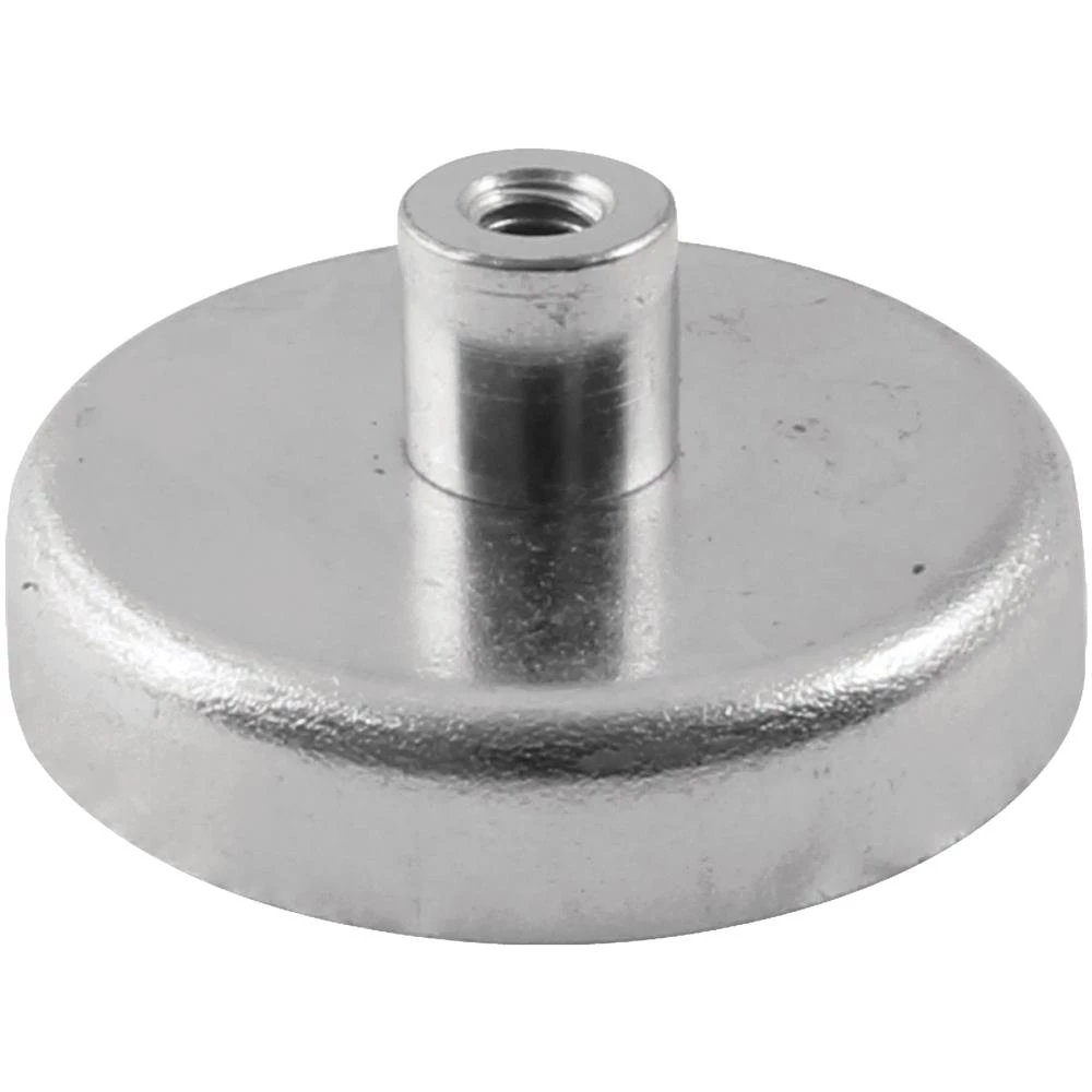 Ferritmagnet indlejret i stålkappe med gevindbøsning. Høj magnetisk kraft. Tåler temperaturer op til 100°C. Fås i flere varianter.