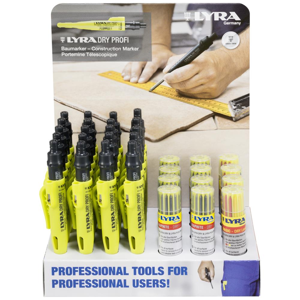 DryProfi display med 20 dybhulspenne og 12 refiller: 8 grafit og 4 basic (rød, gul, grafit).