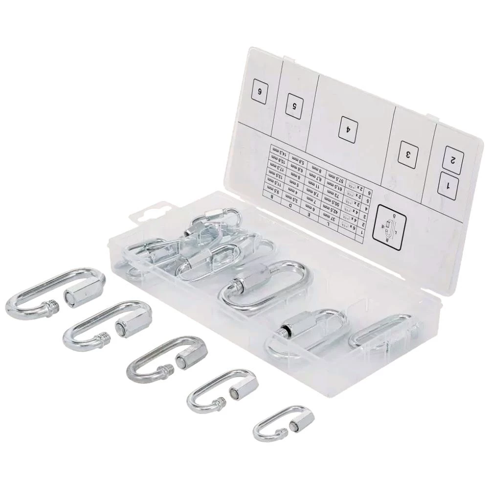 Karabinehagesortiment med 20 dele: 6 × 36 × 17 mm, ø3,5 mm. 4 × 40 × 20 mm, ø4,0 mm – 4 × 49 × 23 mm, ø5,0 mm – 2 × 58 × 27 mm, ø6,0 mm – 2 × 65 × 31 mm, ø7,0 mm – 2 × 75 × 34 mm , ø8,0 mm.