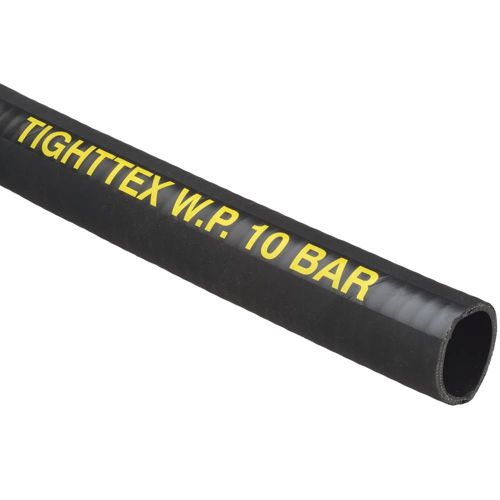 Olie- og benzinslange Tighttex. Sort, dornbygget kvalitetsslange, indvendig glat, elektrisk ledende, udvendig vævviklet med indbygget zink-galvaniseret stålspiral, textilindlæg samt to kobbertråde. Præget med gul skrift: TIGHTTEX W.P. 10 BAR. Velegnet til transport af såvel blyholdig som blyfri benzin samt olie, dieselolie og hydraulik-olie på mineraloliebasis. Tåler aromatindhold på 50%. Udvendig slidstærk og vejrbestandig. Sikkerhedsfaktor: 3:1. Udvendig: SBR/EPDM. Indvendig: NBR – Nitril. Indlæg: Tekstil og stålspiral samt 2 kobbertråde. Temperatur: -40°C til +90°C (olie +100°C). Pris pr. meter. Fås i flere dimensioner.