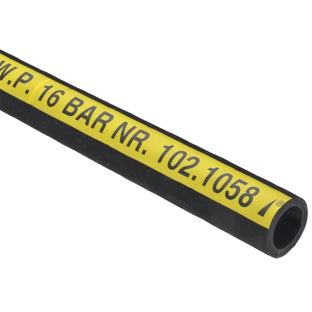 Olietrykslange R, med kobbertråd. Arbejdstryk 16 bar. Sort, med gul stribe. Ruller á 40 mtr. (pris pr. meter). Fås i flere dimensioner.