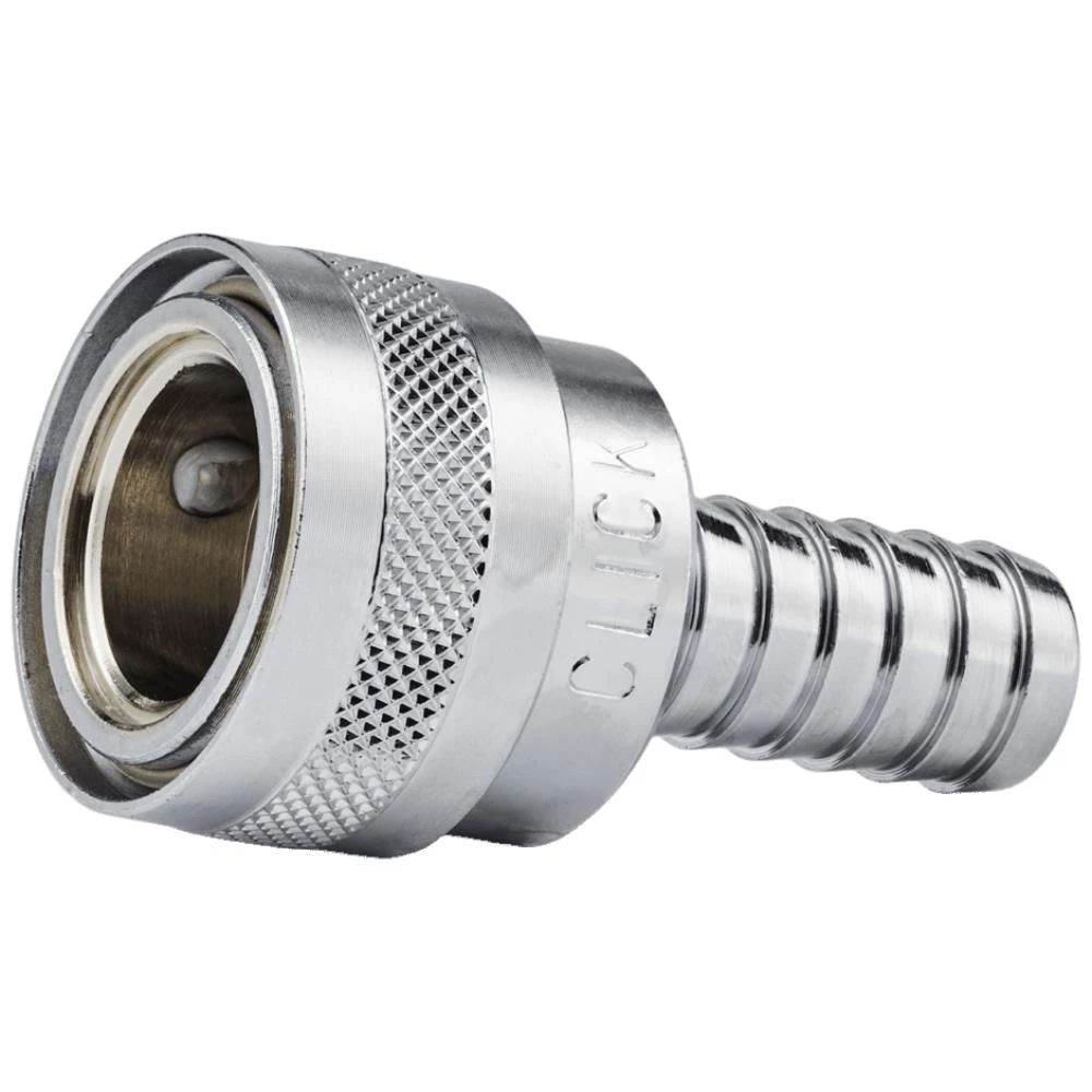 Click koblingssystem anvendeligt til de mest anvendte plastkoblinger i industri, håndværk, hus og have. Click-løsningen er holdbar og robust og velegnet, hvor der er behov for hypige koblingsskift eller hvor man blot ønsker en nem og hurtig løsning. Nippel af forkromet messing, nitrilpakning (NBR), nitril O-ring (NBR), EPDM O-ring på ventil i ventilkoblinger, låsering og fjeder af rustfrit stål, låsekappe af forkromet messing, låsekugler af rustfast hærdet stål og koblingshus af forkromet messing. Kun til vand – ikke til olieprodukter eller trykluft. Maks. arbejdstryk 25 bar, temperatur -30° til +80°C. Fås i flere varianter.
