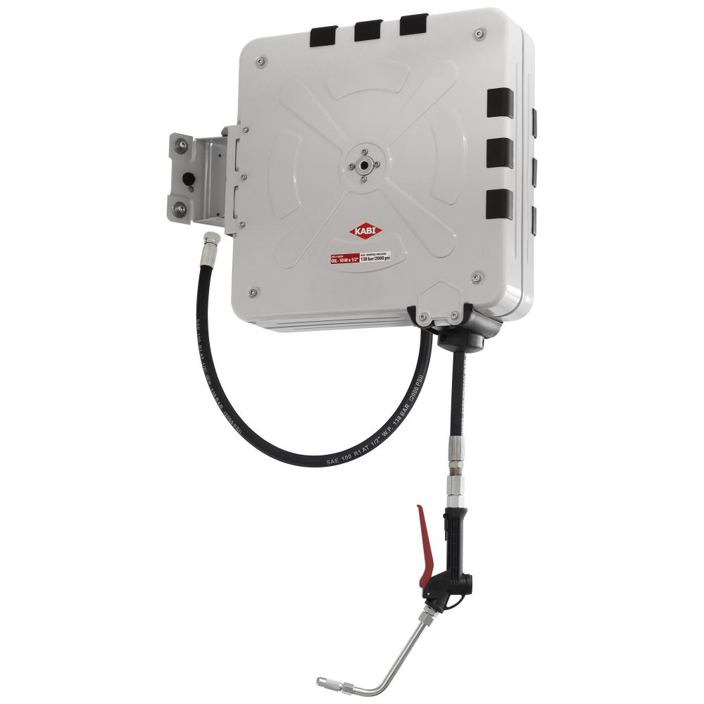 Lukket olie-slangerullesæt med manuel, vinklet pistol med drypventil. Til vedligeholdelse og service inden for køretøj-, industri-, skibs-, landbrugs-, luftfarts sektoren. Slangerullen leveres med svingbart beslag, som kan monteres på loft eller væg. 800 mm tilslutningsslange. 138 bar (2.000 psi) maks. tryk slangerulle. 60 bar maks. tryk oliepistol. Olieudløb 1/2″R. Olietilslutning 1/2″R.