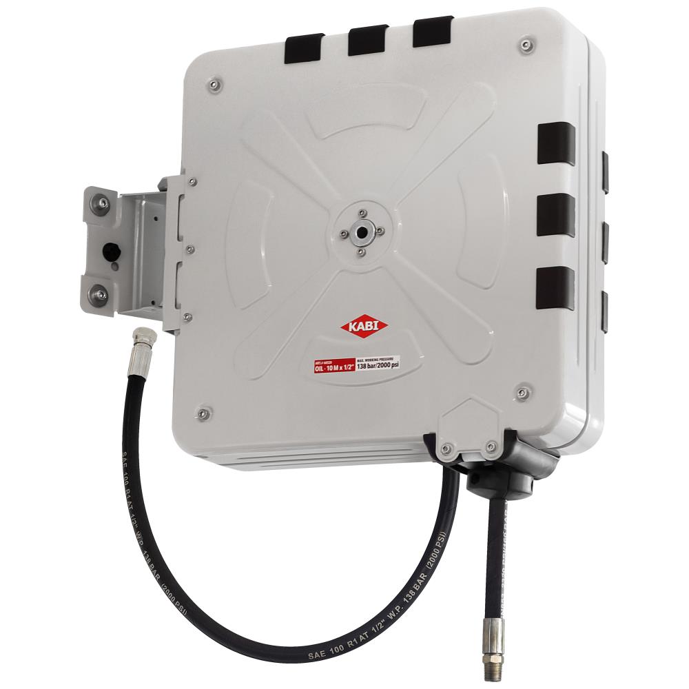 Lukket slangerulle til olie med 10 mtr. 1/2″ slange. Leveres med svingbeslag samt 0,8 mtr. tilslutningsslange. Maks. arbejdstryk 138 bar (2.000 psi). Tilslutningsgevind 1/2″ R.