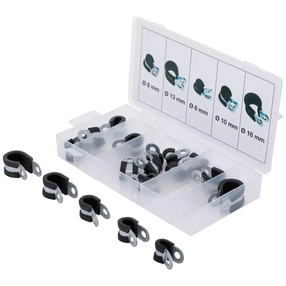 BGS gummiklemmesortiment 6-16 mm 5 str. 18 dele. Gummibelagt slangeklemmesortiment med 18 dele: 8× ø6 mm, 4× ø8 mm, 2× ø10 mm, 2× ø13 mm og 2× ø16 mm. Galvaniseret overfladebehandling.