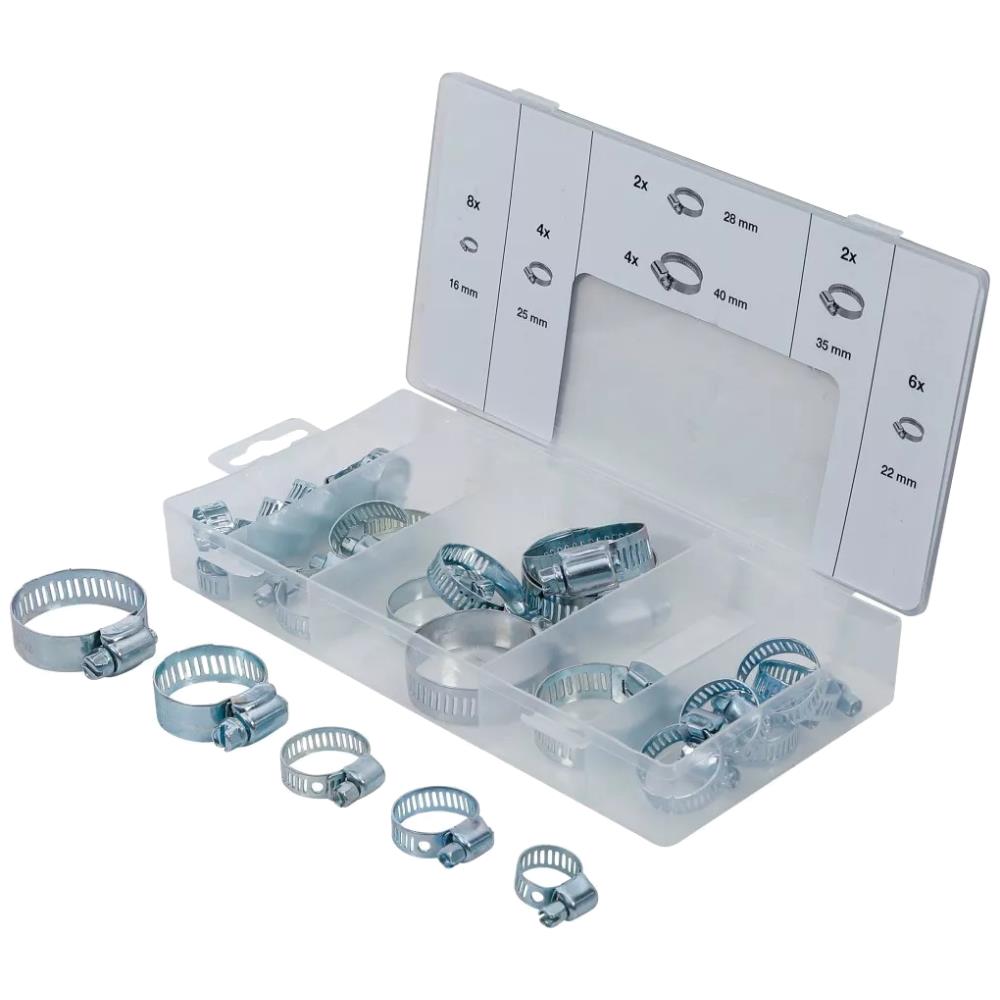 Spændebåndsortiment med 26 dele: 8× ø16 mm. 6× ø22 mm, 4× ø25 mm, 2× ø28 mm, 2× ø35 mm og 4× ø40 mm.