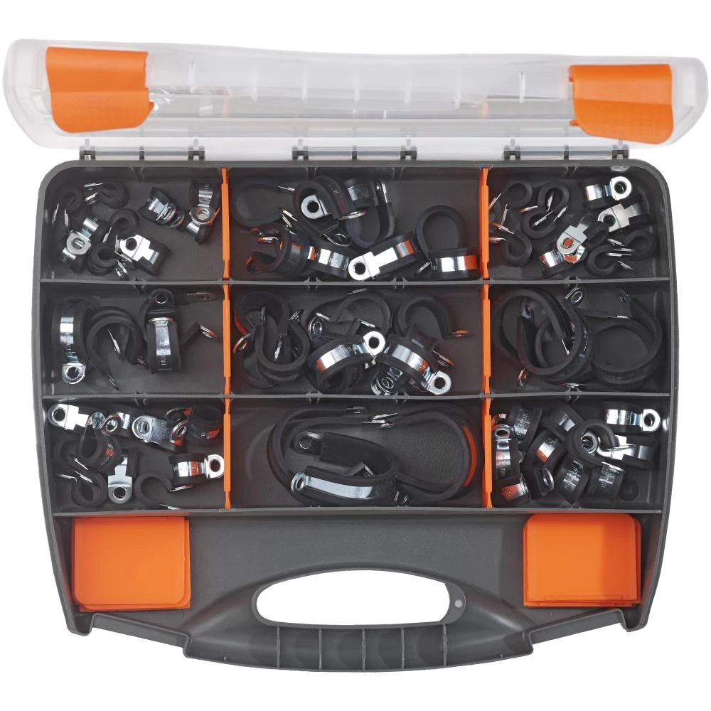 Gummiklemme sortiment nr.75 6-30mm. Sortimentskuffert med galvaniserede gummiklemmer med EPDM gummibelægning.