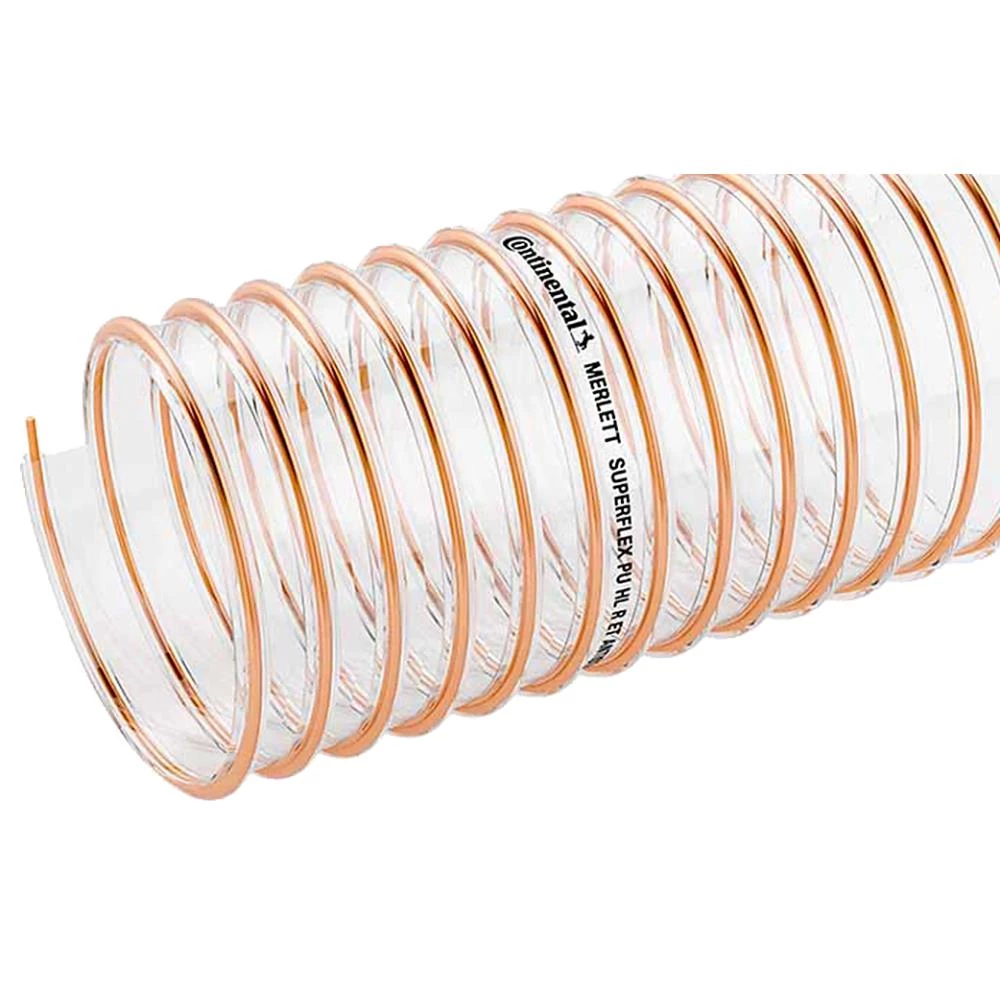 Superflex polyurethane (PU) slange med kobberbelagt stålspiral. Til opsugning og transport af støv, spåner og sliberester. Ruller á 30 mtr. Fås i flere dimensioner.
