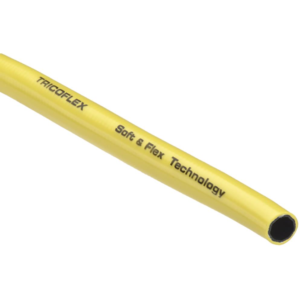 Tricoflex plastslange med strikket fibervæv. Glat, ekstruderet, gul ultra resistent PVC udvendig og glat sort to-lags PVC indvendig. Meget fleksibel industri spuleslange til entreprenører, gartnere og som haveslange af meget høj kvalitet. Temperatur: -15°C til +60°C. Sprængtryk: 3×arbejdstryk. Pris pr. meter. Fås i flere dimensioner.