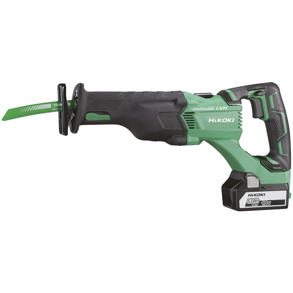 Hurtig og effektiv bajonetsav med stærk kulfri motor, som giver længere brugstid pr. opladning, længere levetid og mindre vedligehold. Auto-mode – automatisk hastighedsregulering i forhold til arbejdsbelastning (1.600 – 2.500 omdr./min.) Elektronisk hastighedsregulering i 3 trin. Konstant hastighedskontrol – feed-back. Elektrisk motorbremse for mere sikker brug. Smal gummieret motorkrop giver nemmere manøvrering. Stor og praktisk ophængskrog. Kraftig integreret LED-lys oplyser mørke arbejdsområder. Vendbar klinge 180° og værktøjsfrit klingeskifte. Værktøjsfri justering af savstilling i savfod. Gummieret vibrationsdæmpet håndtag for komfortabelt brug – LVH (Low Vibration Handle). Overbelastningsbeskyttelse (HPS – Hitachi Protection System). Leveres med batterier og lader eller som tool-only.