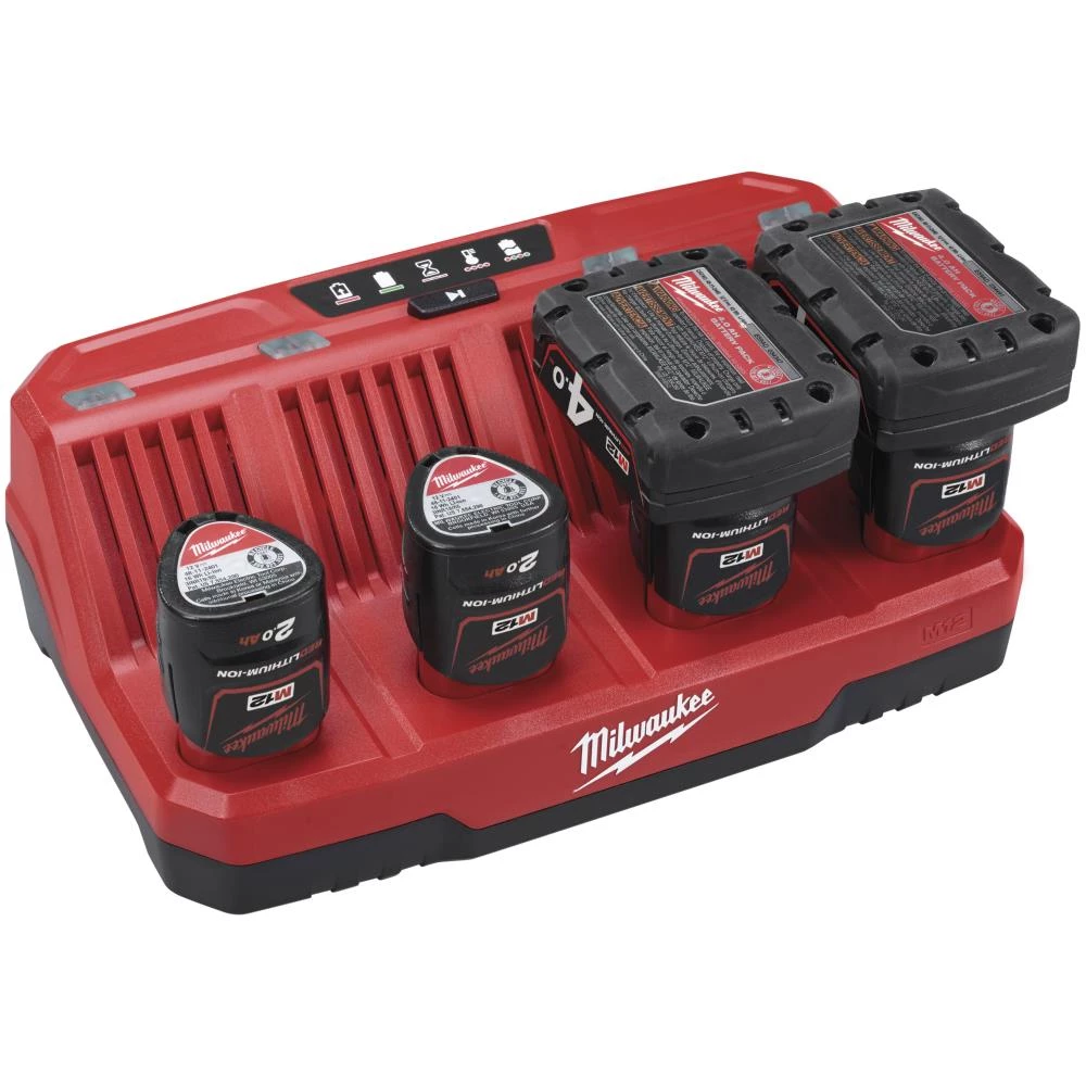 M12 multilader lader op til fire batterier sekventielt. Det er enkelt at vælge hvilket batteri der skal lades først. Modellen er kompakt i udførslen og med integreret ophæng så laderen kan hænge på væggen.