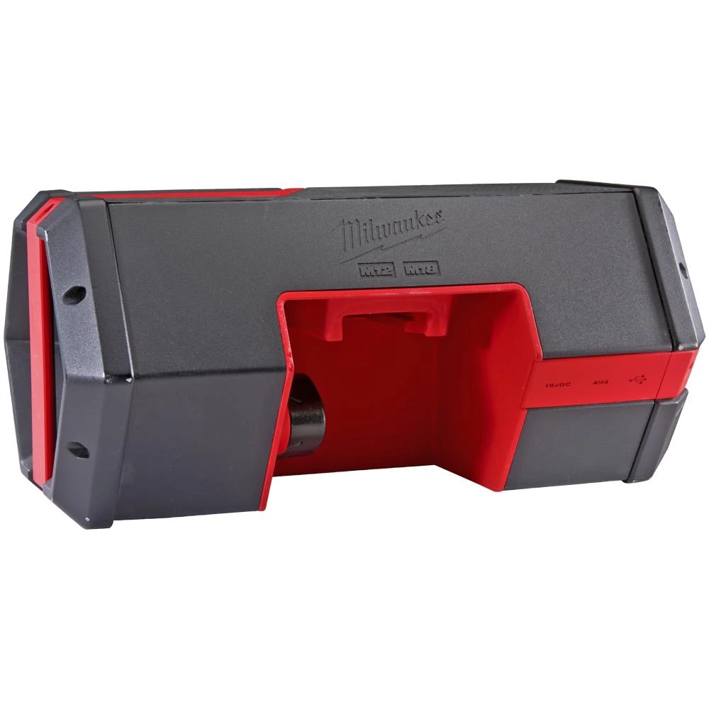 M12-18 JSSP bluetooth arbejdshøjtaler. Bluetooth rækkevidde op til 30 mtr. Passer til alle Milwaukee M12 og M18 batterier. IP54-beskyttelse. Klar lyd selv på højeste lydniveauer. 2.1A USB-oplader, så den kan lade mobiler, tablets og lign. Kvalitetshøjttaler med bass-udgang.