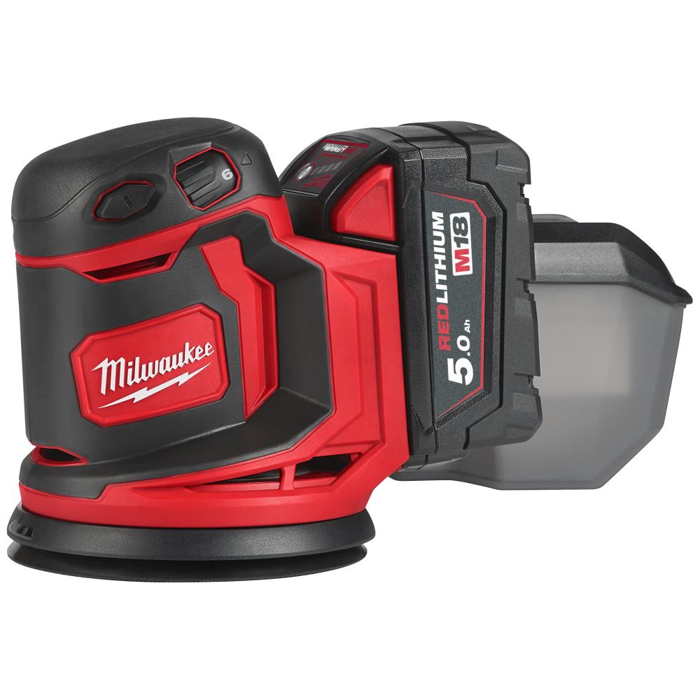 Excentersliber 125mm 2×18V/5Ah M18 BOS125-502B. 18 V excentersliber med motor, som giver mellem 14.000 og 24.000 svingninger i minuttet for ekstremt hurtigt arbejde. Variabel hastighedregulering med seks trin for maksimal alsidighed til de forskellige opgaver. Støvbeholder med integreret filter holder støv indkapslet. Universal fæste med velcro gør det let at skifte slibepapir. Støvsuger-adapter passer til alle Milwaukee støvsugere. Redlink overbelastningsbeskyttelse i både batteri og værktøj giver klassens bedste holdbarhed. Redlithium batteriet er ekstremt solidt konstrueret, med elektronik uden hukommelseseffekt og længere driftstid over batteriets levetid. Fleksibelt batterisystem: passer med alle Milwaukee M18 batterier. Leveres inkl. støvpose, støvudsugnings-adapter, forlænger-adapter og 2× slibepapir. Fås som tool-only eller med batterier og lader.