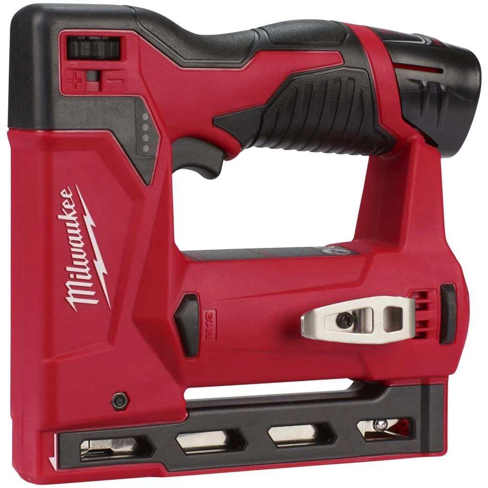 Hæftepistol t/T50 klammer 6-14mm M12 BST-202X. 12 V hæftepistol til alm. T11, T50 og T140 hæfteklammer fra 6 til 14 mm. Ready to Fire-teknologi gør den ekstremt hurtigskydende. Sekvens- eller serieskydning. Affyrer ikke hvis magasinet er tomt. Kompakt længde, højde og bredde for lettere adgang ved opgaver med begrænset plads. Justerbar bæltekrog. Fleksibelt batterisystem: passer til alle Milwaukee M12 batterier. Fås som tool-only eller med batterier og lader.