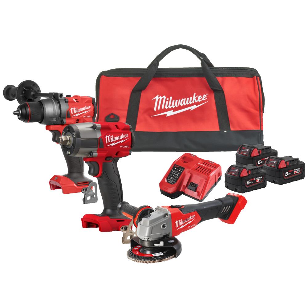 M18 PowerPack med tre maskiner: M18 FDD3 Fuel bore-/skruemaskine, M18 FMTIW2F12 Fuel 1/2″ mellemstor slagnøgle med friktionsring og M18 FSAG125X Fuel 125 mm vinkelsliber med låsbar afbryder. Leveres med 3× M18 5,0 Ah Redlithium-batterier og en 59 min. M12-18FC hurtiglader i en taske.