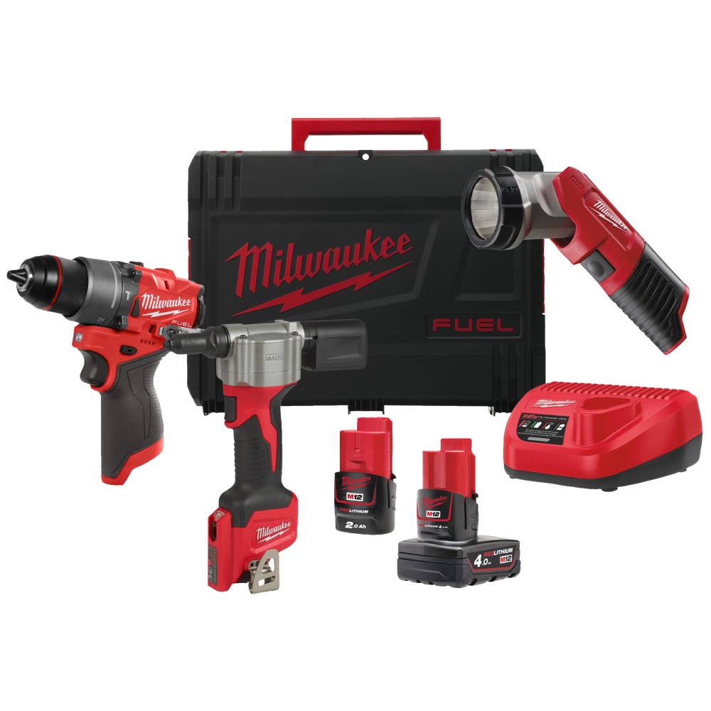Du får en M12 FPD2 slagboremaskine og en M12 BPRT nitteværktøj.