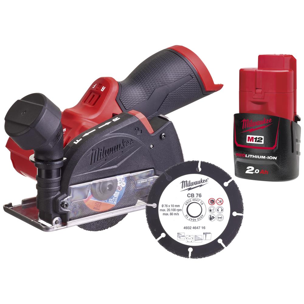 Sampak med M12 skæreværktøj, karbidskive og M12 Redlithium-ion-batteri. Kompakt Fuel multi-skæreværktøj til hurtige og præcise snit med op til 20.000 omdr./min. ø78 mm klinge giver op til 16,3 mm skæredybde. Optimeret ergonomisk design for bedste kontrol og enhåndsbetjening. En rigtig problemløser af et værktøj der bl.a. skærer i stål, rustfrit stål, gips, fibercement, plastik og keramik. Justerbar beskyttelsesskærm og unik frem/tilbage justering af klingerotation så bruger altid er beskyttet mod uanset skæreposition. Quick release’ støvsko med dybdejustering og støvport. Strømindikator og LED-lys. Fuel platform. Den kulfrie Powerstate-motor, Redlithium-batteriet og Redlink Plus elektronikken leverer uovertruffen kraft, driftstid og holdbarhed. Fleksibelt batterisystem: passer med alle Milwaukee M12 batterier. Leveres inkl. diamantfliseklinge, karbidklinge, metalskæreklinge og justerbar støvskærm. Leveres uden batter og lader. Karbidklinge (ø76×10 mm) egnet til træ, plast og gipsplader – velegnet til skæring af alle typer blødere materialer. 12 V 2,0 Ah Redlithium-ion-batteri med Redlink elektronisk overbelastningsbeskyttelse, som forhindrer skader på værktøjet ved for hård anvendelse. Individuel celleovervågning optimerer værktøjets driftstid og sikrer lang batterilevetid. Holdbar batterikonstruktion med slagfast metalramme forhindrer skader fra vibrationer eller fald. Kan tåle varme- og kuldeudsving. Fungerer ved driftstemperaturer ned til ÷20°C. Afladningsbeskyttelse forhindrer skader på battericellerne fra overafladning.