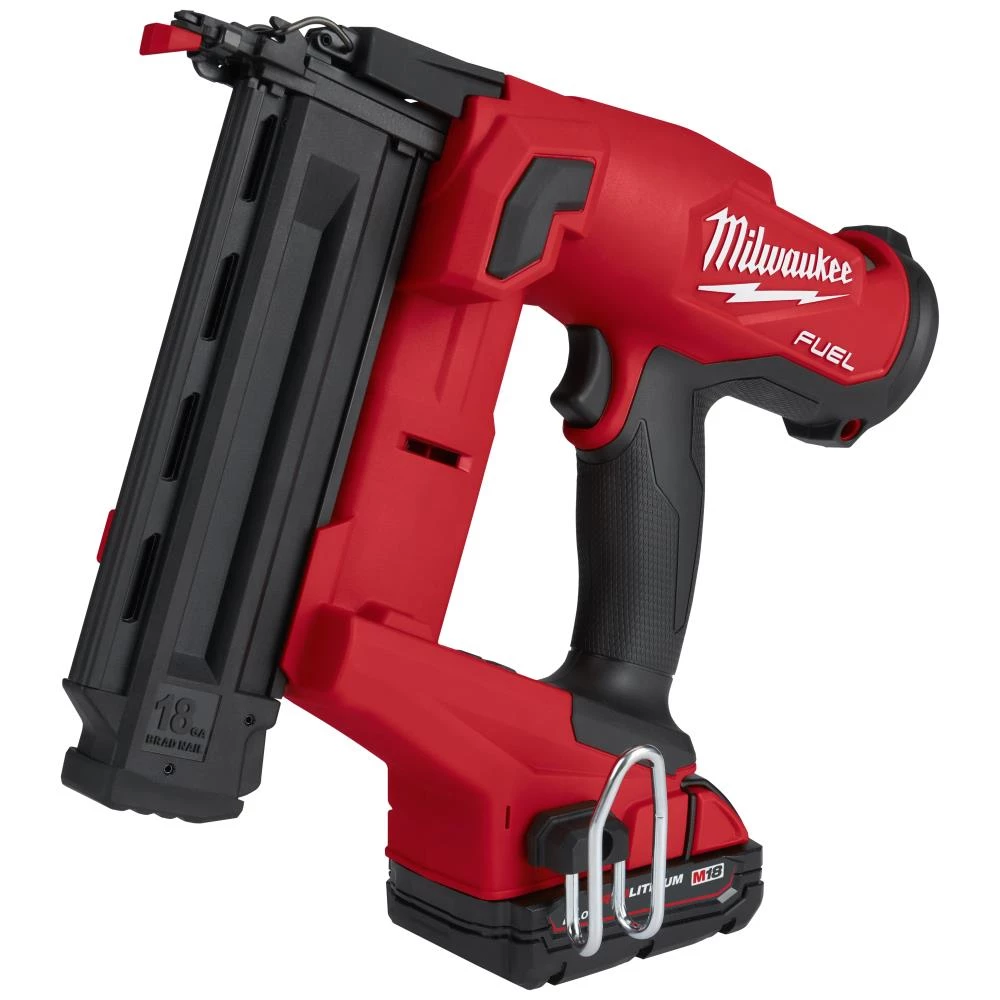 Stiftepistol M18 FN18GS-202X. 18 V stiftpistol med forskellige mundstykker med opbevaring på selve maskinen for optimal finish uanset opgaven. Ingen gas eller rengøring er nødvendig – designet for maksimeret holdbarhed og pålidelighed for de mest krævende brugere. Mindre huller i præcis samme størrelse som dykkerhovedet efterlader en flot overfladefinish. Ready-to-Fire-teknologi gør, at den altid skyder med det samme, der trykkes. Fremragende kraft til konsekvent at sænke dykkere under overfladen i hårdt træ. Let og hurtig dybdejustering uden brug af værktøj/nøgle. Affyrer ikke når magasinet er tomt. Let at fjerne evt. fastkørte dykkere. Dykkere ø1,2 mm. Sømtype 16/54 mm. Magasinkapacitet 110 søm. Magasinvinkel 0°. Skudrate 900. LED-arbejdslys. Fleksibelt batterisystem: passer med alle Milwaukee M18 batterier. Fås som tool-only eller med batterier og lader.