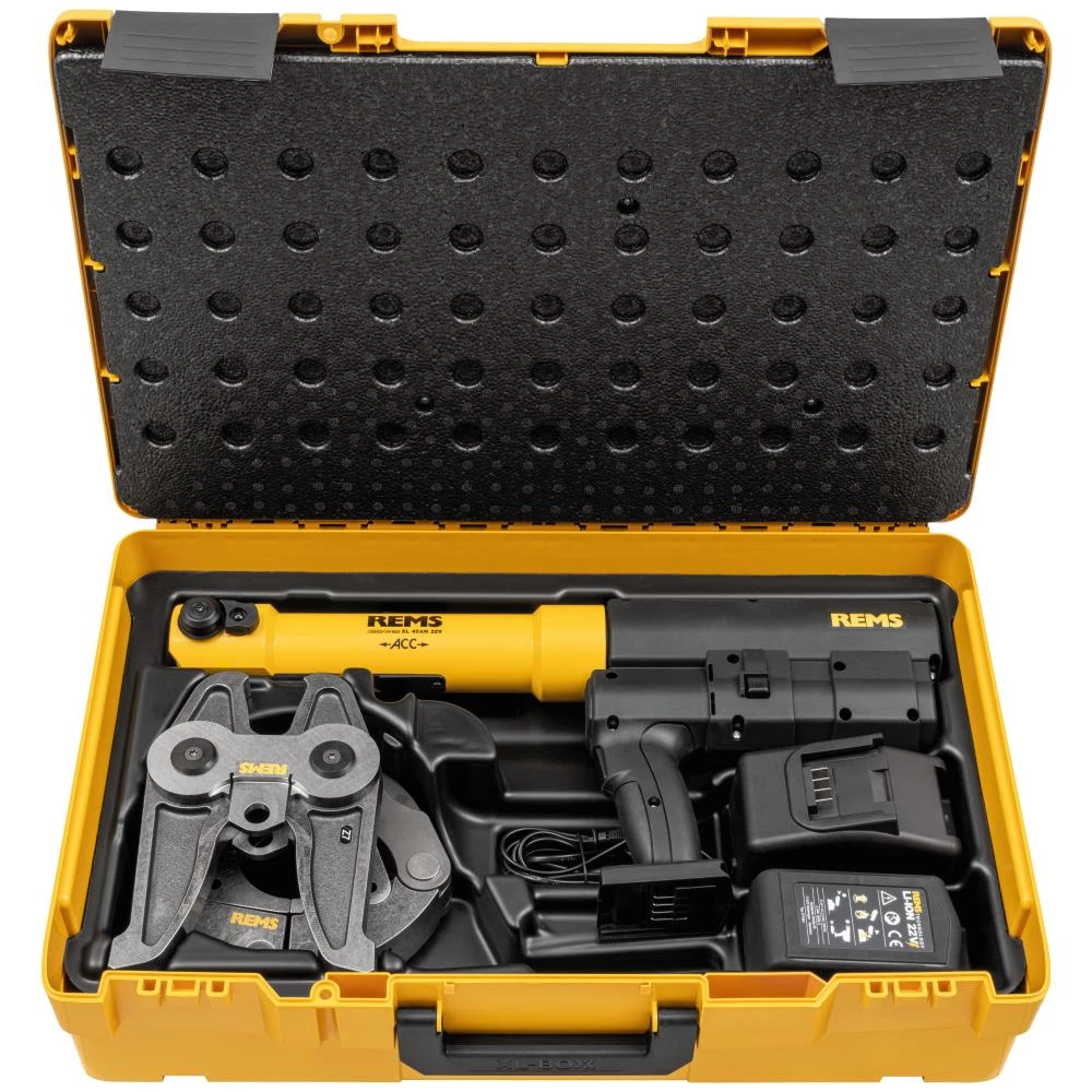Kraftig elektrohydraulisk akku-radialpresse XL med automatisk tilbageløb til fremstilling af presssamlinger XL på alle gængse pressfitting-systemer (rørpresssamlinger ø64-108 mm, ø2.1/2″-4″). Anti-vibrations-system: speciel drevteknik med masseudligning og grebsflader med softgrip. Automatisk tilbageløb efter fuldendt pressning. LED-arbejdslampe til oplysning af arbejdsstedet. Maskintilsstandskontrol. Drejelig pressingfastgørelse, drejevinkel >360°. Sikker placering af mellemtangen ved hjælp af en automatisk låseanordning. Presskraft 45kN. Sikkerhedsafbryder. Til drift af REMS pressringe XL. Leveres i L-Boxx systemkasse med batteri og hurtiglader 100-240V, 50-60 Hz, 90W – med eller uden Mellemtang Z7 XL 45kN.