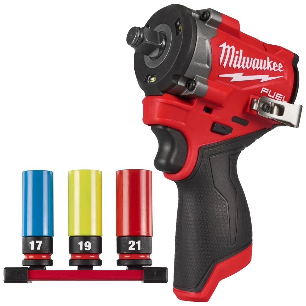 Sampak med 12 V slagnøgle og slagtopsæt med tre dele. M12 Fuel 1/2″ kompakt slagnøgle med friktionsring. 542 Nm tilspændingsmoment og 746 Nm løsrivningsmoment. 3.000 omdr./min. for enestående arbejdskapacitet. 4-trins Drive control giver brugeren præcis kontrol. Kompakt design med en samlet længde på 122 mm. Integrerede LED-lamper. Leveres uden batteri og lader. 1/2″ Shockwave Impact Duty slagtopsæt til autobranchen. Farvekodet for nem identifikation. Fremstillet af legeret stål for øget styrke og holdbarhed. Slagtoppe med tynde vægge giver nem adgang i trange områder. Leveres på magnetskinne: ø17, 19, 21 mm.