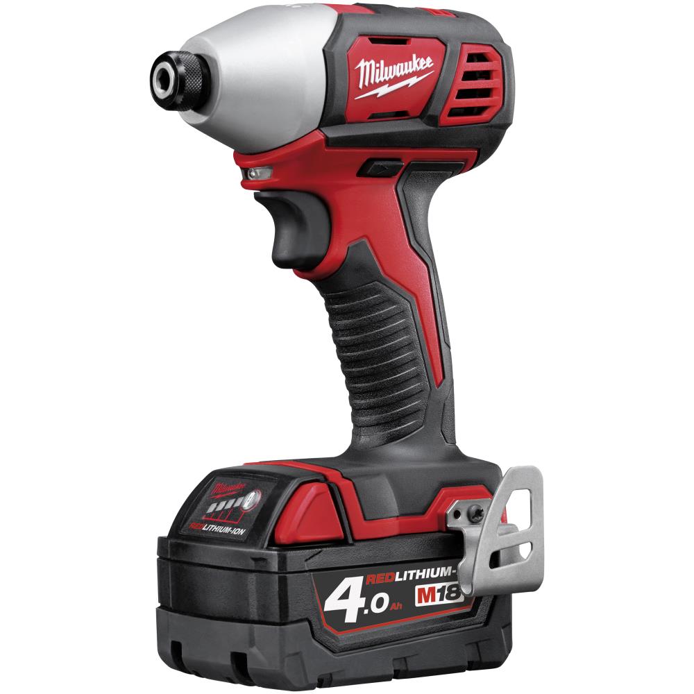 Slagskruemaskine 1/4″ 6kt 180Nm M18 BID-402C. M18 kompakt 1/4″ Hex slagskruemaskine i kompakt design. Slagskruemaskinen måler 140 mm i længden hvilket gør den ideel til at arbejde på steder med begrænset plads. Maskinen er udstyret med en 4-polet motor, som leverer høj ydelse og samtidig maksimerer ydelsen i forhold til vægten. Derudover er den udstyret med Redlink elektronisk overbelastningsbeskyttelse i både batteri og værktøj, heavy-duty fuldisoleret metalgearkasse og gear for maksimalt drejningsmoment, samt 1/4″ Hex med kliklås for enhånds bitsskift og individuel celleovervågning, der optimerer værktøjets driftstid og sikrer lang batterilevetid. Strømindikator og LED-lys. Redlithium-ion batteriet er ekstremt solidt konstrueret, med elektronik uden hukommelseseffekt og længere driftstid over batteriets levetid. Fleksibelt batterisystem: Passer med alle Milwaukee M18 batterier. Fås som tool-only eller med batterier og lader.