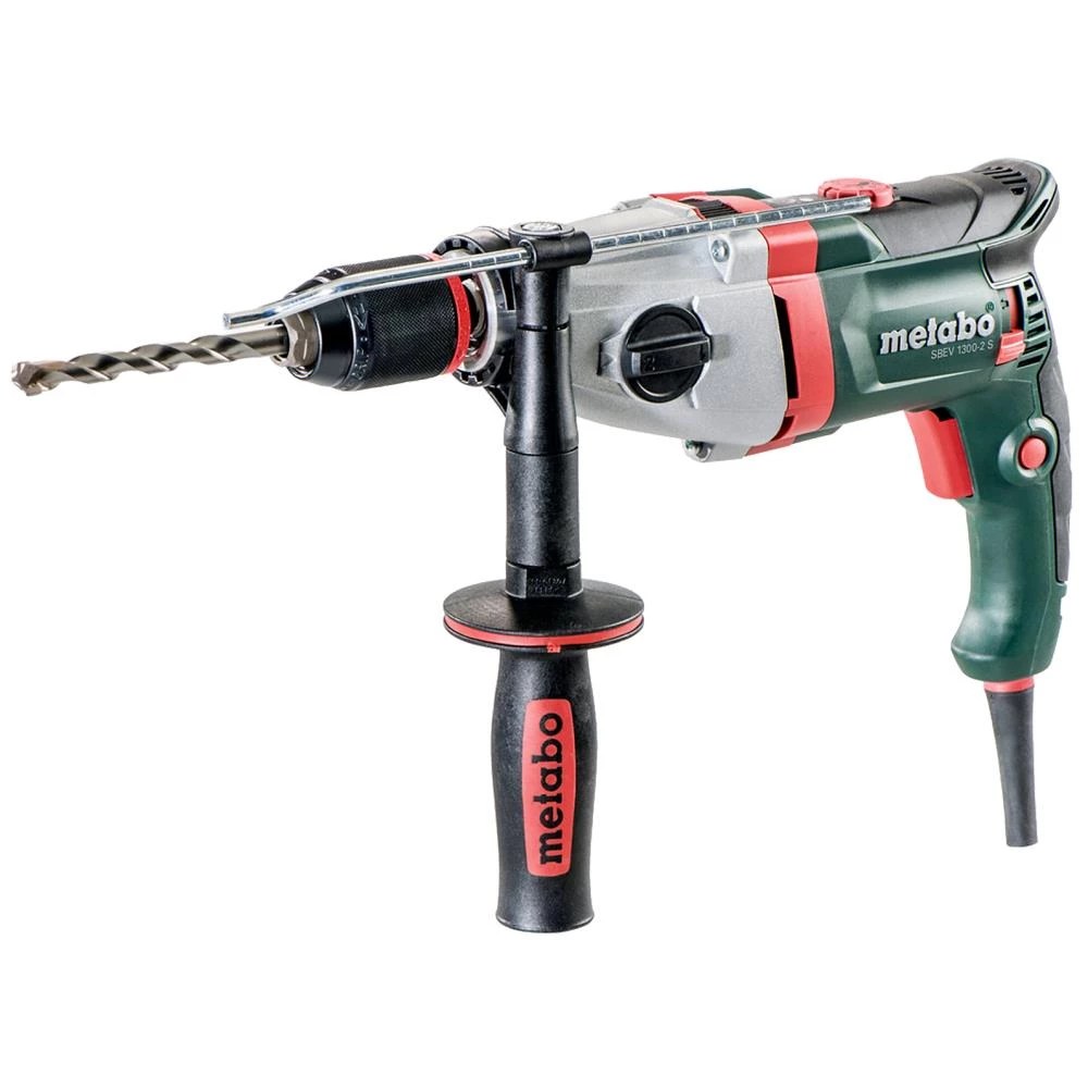 Slagboremaskine SBEV 1300-2 S inkl. selvspændende borepatron Futuro Plus og med Vario-Tacho-Constamatic (VTC)-helperiodeelektronik til arbejde med hastigheder, der passer til materialet og som forbliver konstante under belastning. Indstillingshjul til forvalg af hastigheden. Impulsdrift, der kan kobles til, for udskruning af fastsiddende skruer og forboring på glatte overflader. Robust gearhus i trykstøbt aluminium for optimal varmeafledning og lang levetid. Drejelig kulbro for maksimal effekt også i venstregang f.eks. ved udskruning af fastsiddende skruer. Metabo Marathon-motor med støvbeskyttelse for lang levetid. Metabo S-automatic sikkerhedskobling som sikrer mekanisk frakobling af motoren, hvis det anvendte værktøj blokerer. Højre-/venstregang. Selvspændende borepatron og spindelstop for nemt værktøjsskift med én hånd. Spindel med indvendig sekskant til skruemaskine-bits til brug uden borepatron. Overbelastningssikring som beskytter motoren mod overophedning. Genstartsikring som forhindrer utilsigtet start af maskinen efter strømafbrydelse. Kabelskånende kugletylle til optimal bevægelsesfrihed under arbejdet. Display for slitage på kul. Der medfølger selvspændende borepatron Futuro Plus, ekstra håndtag med gummibelægning samt boredybdestop. Leveres i plastkuffert.