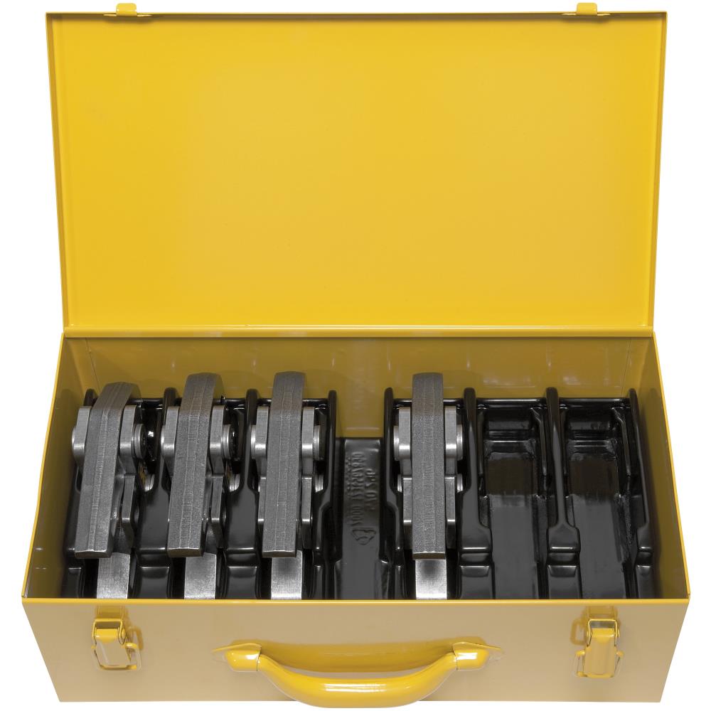 Stålkasse med indlæg til 8 presstænger Mini/Mini gevindklippetang og rum til rørskærer op til 42 mm.