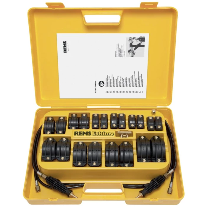 Rems Eskimo indfrysning i stedet for tømning. Lynhurtig. Automatisk tilførsel af kølemiddel. Høj kuldeydelse, fx. 3/4″ stålrør på kun 5 min. Særligt smalle, uopslidelige indfrysningsmanchetter. Til hurtig og nem indfrysning af ikke tømte rørledninger med kulsyre som kølemiddel. Til vedligeholdelse, reparation og udbygning af rørsystemer. Stål-, kobber-, plast-, samt plastrør med metallisk indlæg Ø 1/8-2″ Ø 10-60 mm. Kølemiddel: kulsyre. Køleevne ned til -79°C. Ikke giftig, ikke brændbar.