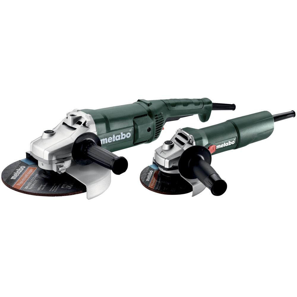 Sampak af stor og lille vinkelsliber hhv. 230 mm WP2200 og 125 mm W750. WP2200 er udstyret med paddle-kontakt med dødmandsafbryder og spindellås for skiveskift. WP750 med spindellås for skiveskift.