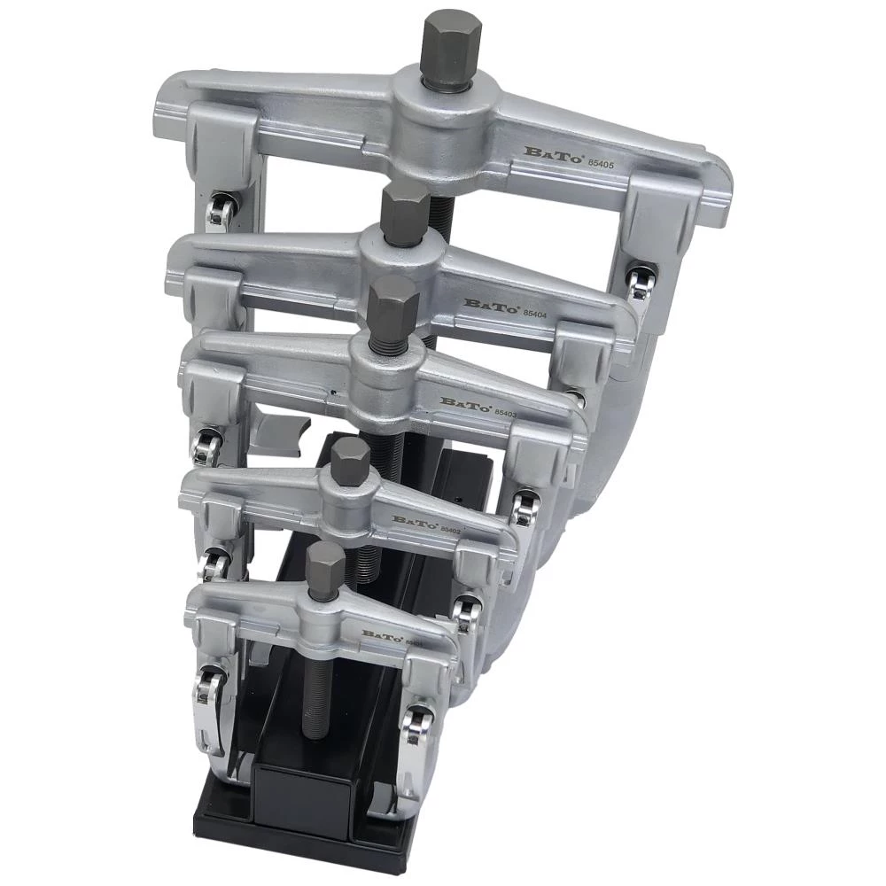 Aftrækkersæt med fem dele på praktisk stander. 2-arms aftrækkere med metalclips-lås for Quick-justering. Sættet indeholder: 40-90 mm, 90-170 mm, 115-210 mm, 125-260 mm og 170-335 mm.
