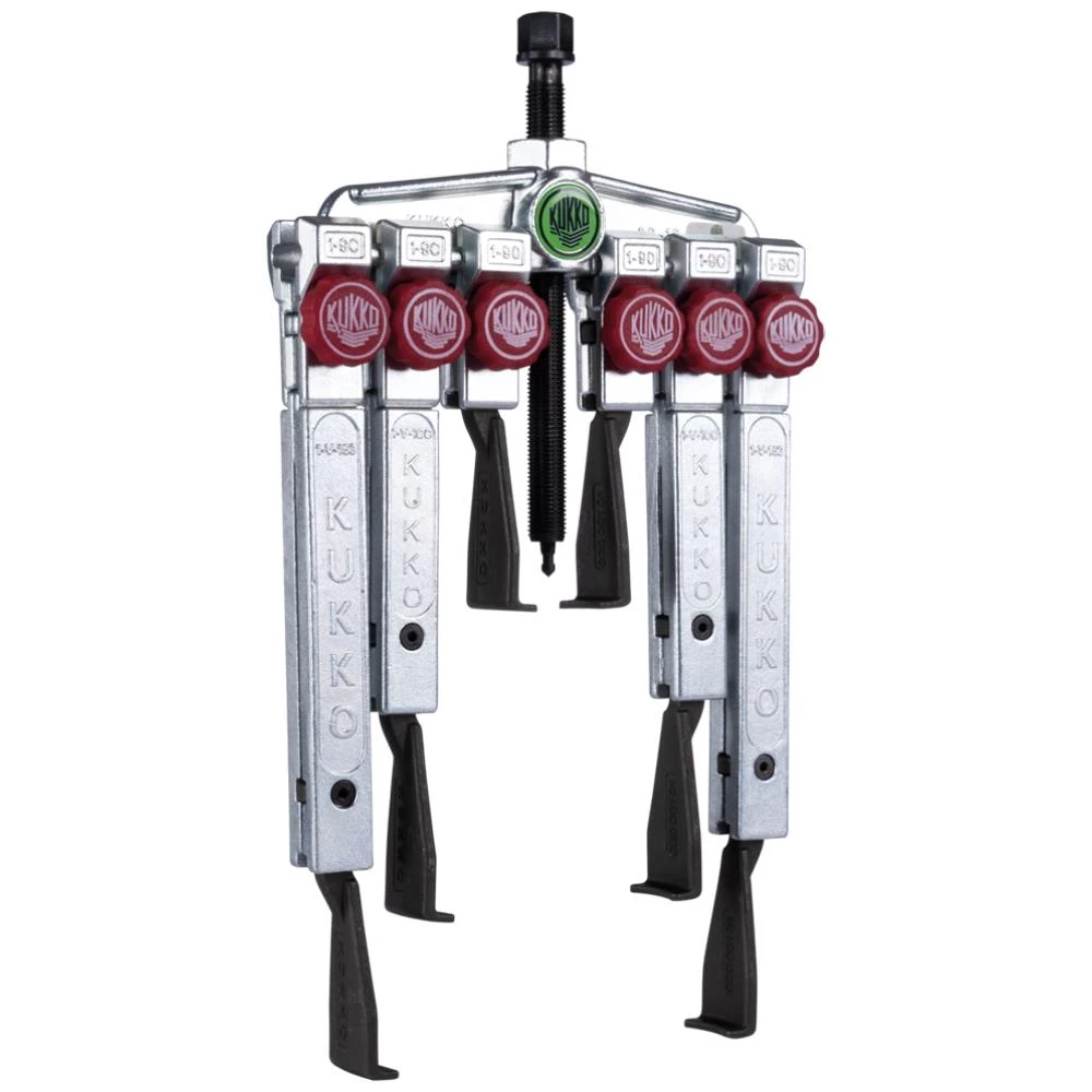 Serie 20-SP universalaftrækker med smalle aftrækningskroge i sæt til aftrækning af lejer, tandhjul, skiver etc. til snævre og svært tilgængelige mellemrum. I enhver position – selv under fuld belastning – glidende, parallelle aftrækningskroge. Trinløst forskydelige aftrækningskroge på traversen. Optimal tilpasning af spindlerne til akslen vha. 2-sidet spindelspids (kugle og spids). Mekanisk spindel og specialcoatet, valset gevind. Variabel spændedybde takket være aftrækningskroge i forskellige længder. Kan udstyres med forskellige aftrækningskrogstyper efter ønske. Kan anvendes som ud- og indvendig aftrækker ved at dreje aftrækningskrogene. Også egnet til aftrækning af asymmetriske emner. Spindelhovedets krave forhindrer, at nøglen glider af. Traversen har en sekskantprofil til at holde imod.