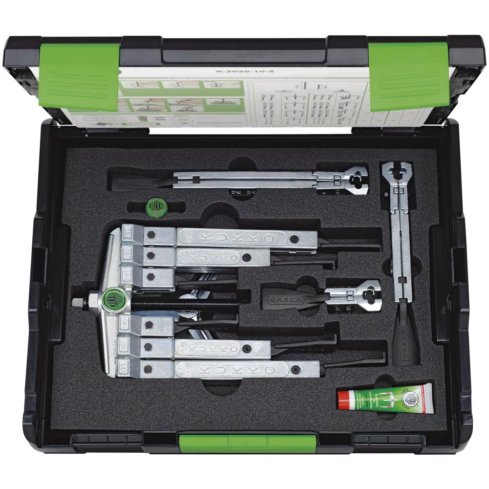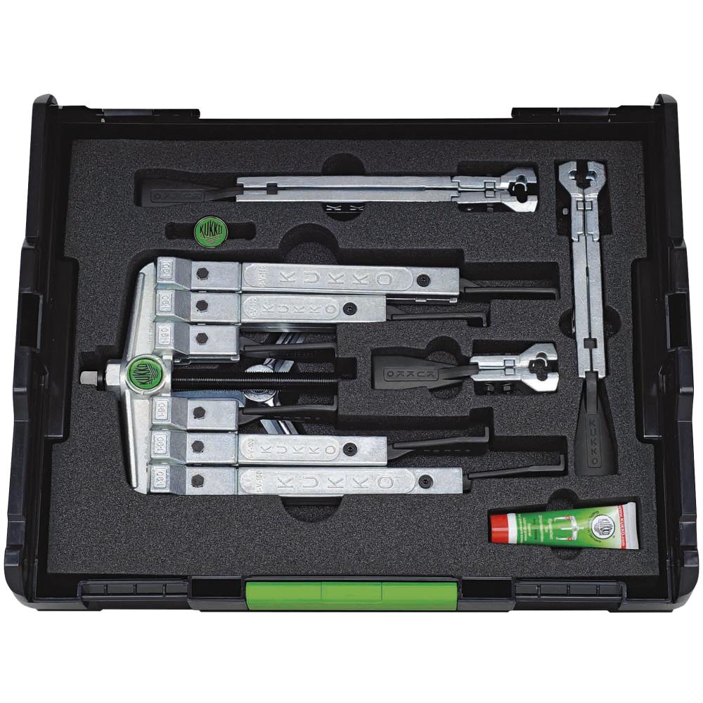 2 og 3 benet aftrækkersæt, 2 benet tager diameter op til 120 mm. og 3 benet op til 130 mm. Leveres med 3 sæt ben, som kan tage dybde 100-200-250 mm. De forlænger sæt kan sættes sammen, så den totale dybde kan komme på 350 mm. Leveres i robust transportkuffert samt en ekstra lang spindel på 250 mm.