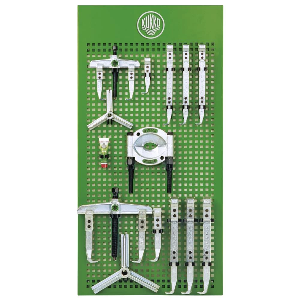 Kukko aftrækkersæt på tavle. 2/3 benet aftrækker 0-200/300 mm. Lejeadskiller 22-115 mm. Inkl. tavle og kroge til ophæng