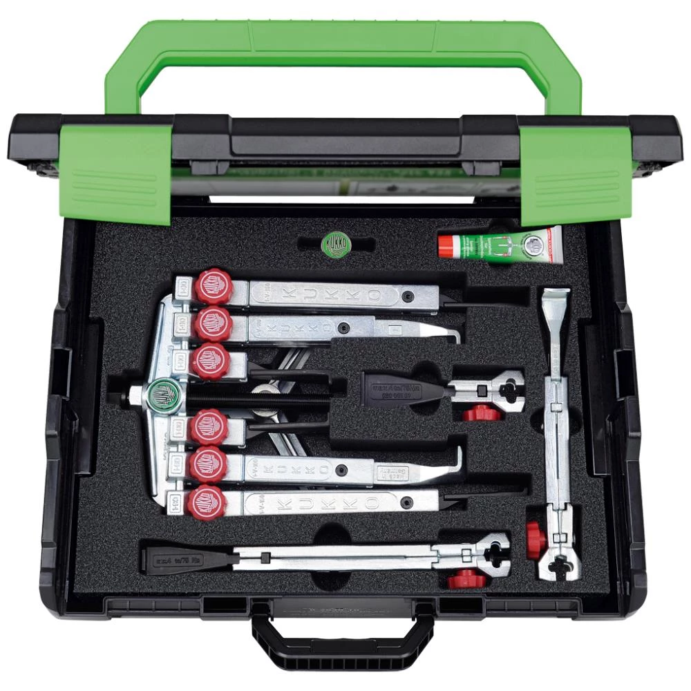 Serie K-2030-10+S-T 2- og 3-armet universalaftrækkersæt med smalle, hurtigt justerbare aftrækningskroge til aftrækning af geartandhjul, lejer, spidshjul, synkroniseringsringe etc. til ekstremt trange og svært tilgængelige mellemrum. Sættet muliggør sammensætning af otte forskellige aftrækkermodeller via kombinationen af aftrækningskrog og forlængelser. Ekstremt smalle aftrækningskroge i trapezform med hurtigjustering (quick adjust). Trinløst forskydelige aftrækningskroge på traversen. I enhver position – selv under fuld belastning – parallelle aftrækningskroge. Korte og lange mekaniske spindler. Specialcoatet, valset gevind. Betjeningsvejledning i dækslet. Inkl. personlig KUKKO-chip-kode.