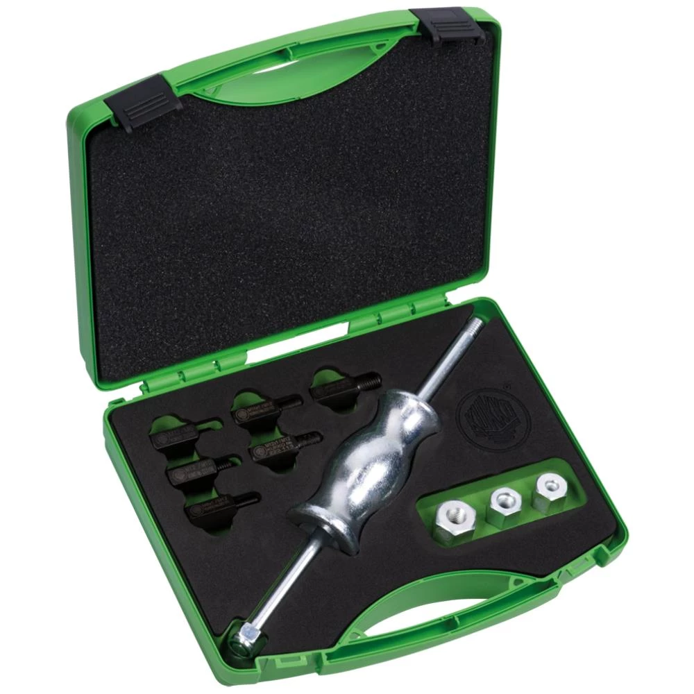 Serie KS-22 glidehammersæt til udtrækning af bøsninger samt komponenter med gevind (stifter, pasfjedre, bolte etc.). Gildehammerstangens tilslutningsgevind: M12. Indv. Gevind: M12-M7, M12-M10, M12-15-16G. Leveres i kuffert.