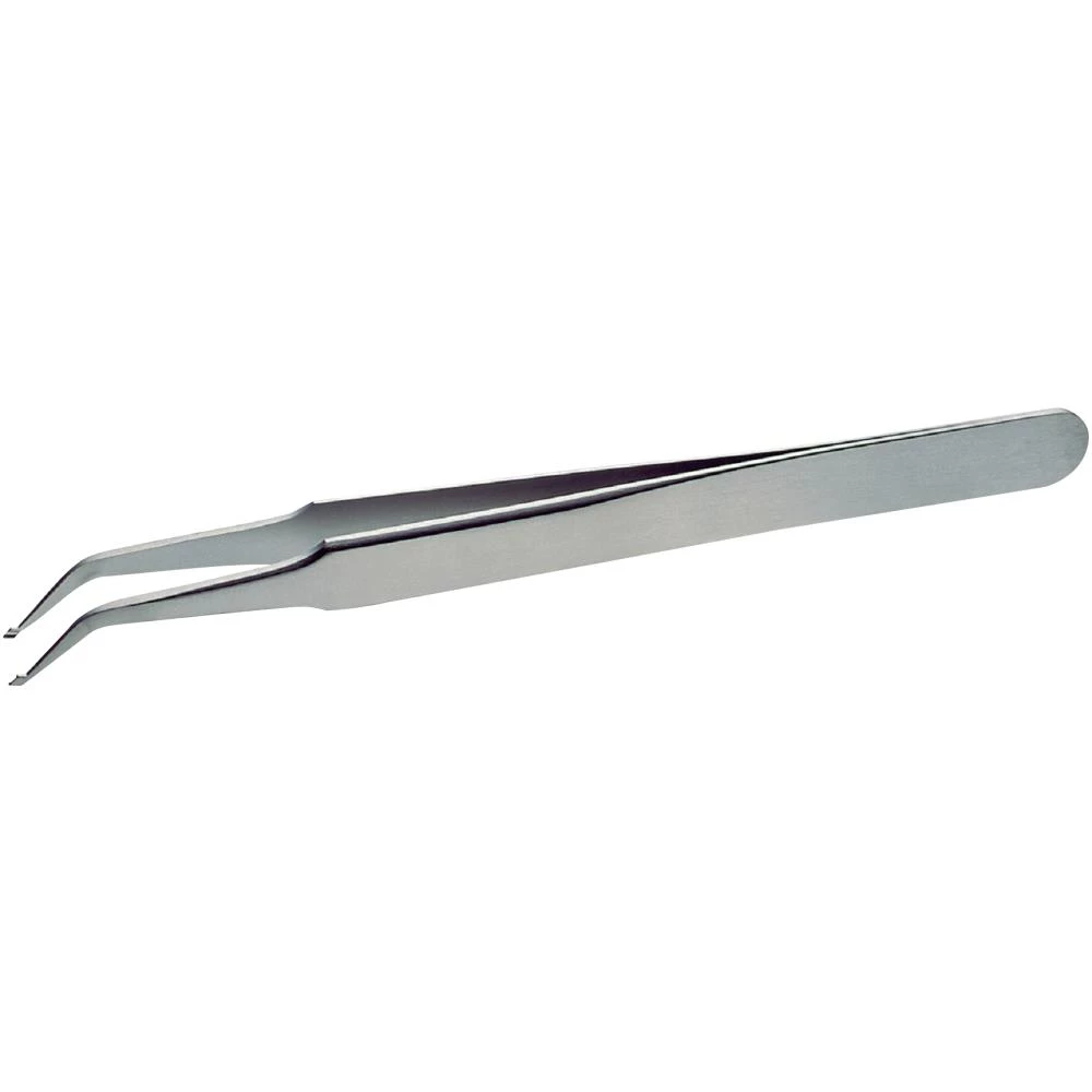 SMD-pincet for placering af 5 mm monolitiske chip-kondensatorer med flad grundflade. Materiale: Rustfast stål, antimagnetisk, syrefast. Finish: Poleret. Med riflede, 2 mm lange spidser.