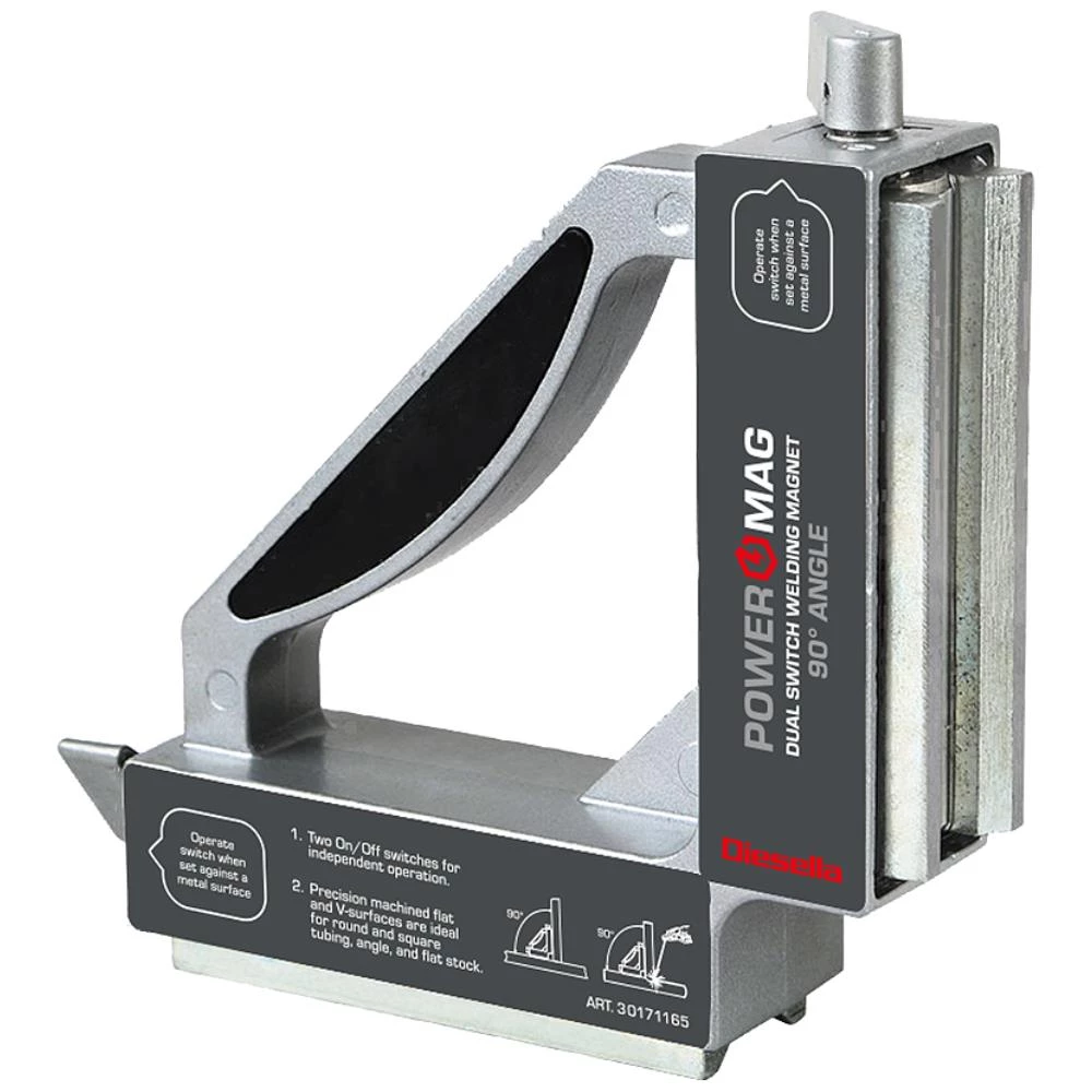 Powermag magnetvinkel med fast 90° vinkel og dobbelt on/off funktion. Kan holde op til 50 kg/490 Nm. Til professionelle jobs hvor der kræves stærke holdkrafter. Holder både flade og runde emner. Med to tænd/sluk-kontakter til selvstændig drift. Måler 148×148×38 mm.