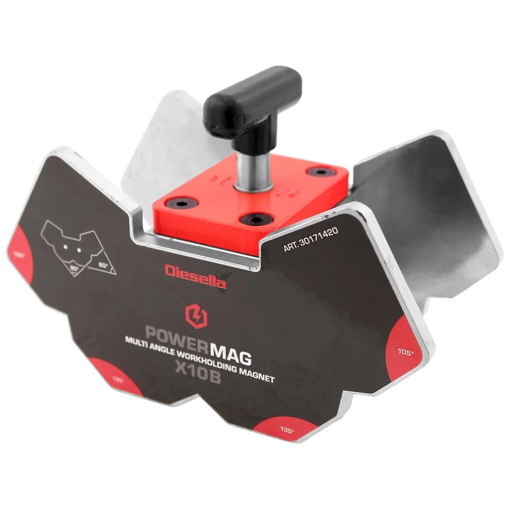 Powermag X10B multivinkel svejsemagnet med on/off-funktion. Flere muligheder og vinkler i et produkt. Hver multivinkel har flere fælles vinkler: 45°/135°, 60°/120°, 75°/105° og 90°. Powermag kan sættes op og aktiveres på sekunder og har en super stærk holdekraft på alle sider: kan anvendes på flade, runde eller ujævne emner. Kan holde op til 120 kg/1.175 Nm.