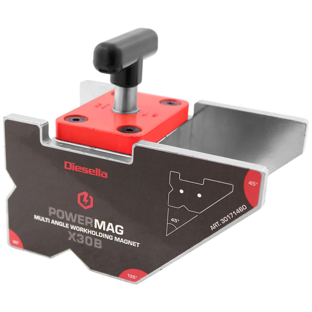 Powermag X30B multivinkel svejsemagnet med on/off-funktion. Flere muligheder og vinkler i et produkt. Hver multivinkel har flere fælles vinkler: 45°/135° og 90°. Powermag kan sættes op og aktiveres på sekunder og har en super stærk holdekraft på alle sider: kan anvendes på flade, runde eller ujævne emner. Kan holde op til 120 kg/1.175 Nm.