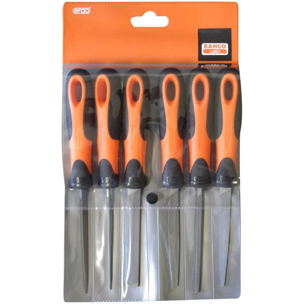 Filehæfte udviklet i henhold til Bahcos ERGO program. Præcisionsfile i sæt, til finere værktøjsmagerarbejde og andet pudse- og filearbejde. Indeholdende 1 stk. af hver af typerne: ansats, flad, firkant, trekant, rund og halvrund. I alt 6 stk. med hæfte. Leveres i plastmappe.